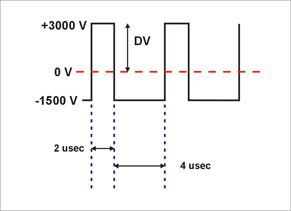 The separation of the ions between the plates will require the application of a specialized waveform which we call an 'asymmetric' waveform. For example, this waveform can be a square wave in which a high positive voltage is applied for a short time and a low negative voltage is applied for a longer time. However, the area (voltage x time) of the positive and negative portion of the wave must be equal. The peak voltage of the waveform is called the 'dispersion voltage', or 'DV' for short. Diagram 1 shows an example of the waveform.