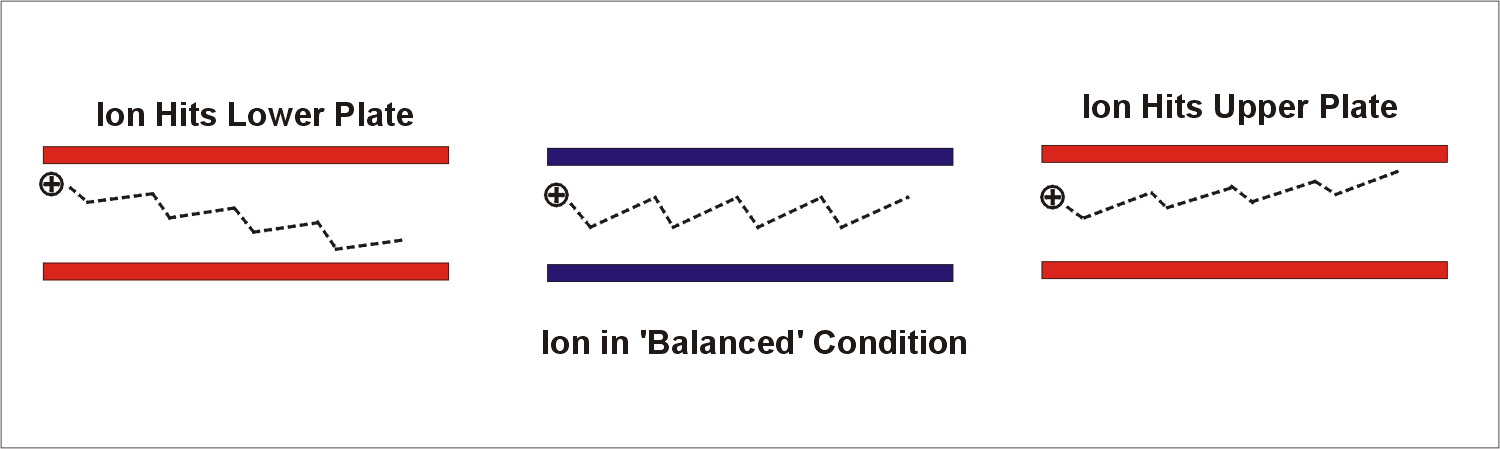 Diagram 3. Ions transmitted through FAIMS at a fixed DV and CV. Only ions in a 'balanced' condition can successfully travel through the plates.