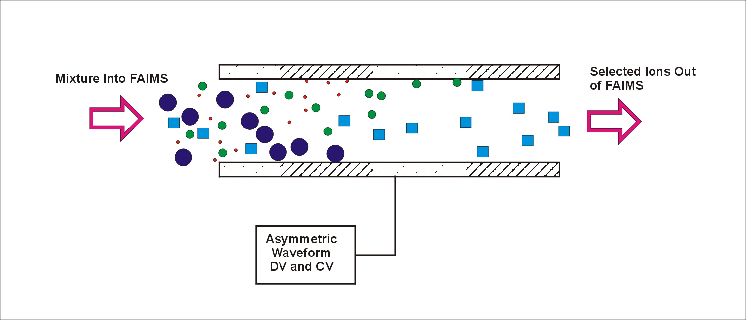 If a mixture of ions of different sizes and types is introduced between two metal plates, the application of high voltage in an appropriate waveform to the plates will create a condition where some types of ions drift and hit the metal plates while other types of ions remain between the plates. This is the separation of ions which we can achieve with FAIMS.