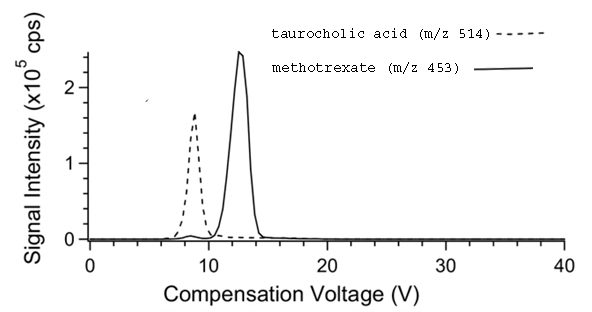 Figure 4. The effect of temperatures of the inner and outer electrodes in concentric cylinder FAIMS on the CV spectrum of the ions of taurocholic acid (m/z514) and methotrexate (m/z 453). Inner and outer electrode temperatures were: (top) 36oC/76oC, (middle) 76oC/76oC, and(bottom) 116oC/76oC.