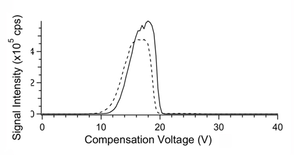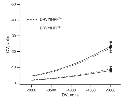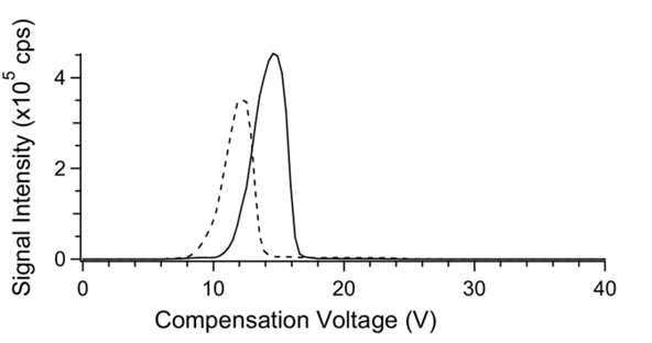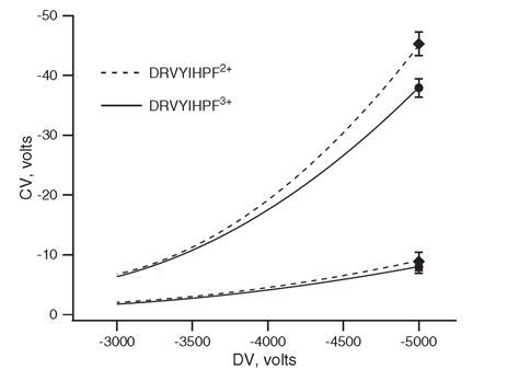 Figure 1 reminds us that the electric field strength is important in separation by FAIMS. The traces indicate the observed compensation voltage(CV) at various applied dispersion voltages(DV) for two charge states of a selected peptide. Firstly the CV of transmission of these ions increases with applied DV. Secondly, the CV's of the two ions become more different from each other as the DV increases.